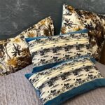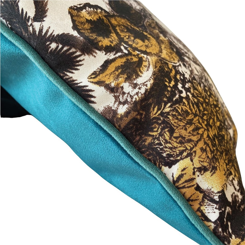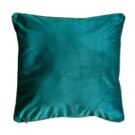Housse de coussin tendance en velours couleur paon bleu, passepoilée par velours bleu jade et contrastée par coton imprimé avec motif exotique riche en details. Relookez votre interior à la belle tendance des couleurs vibrantes.