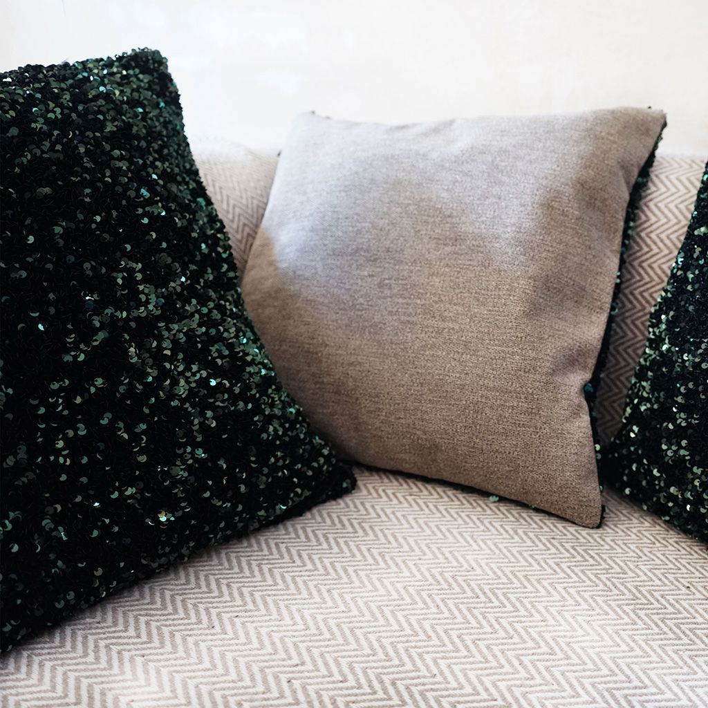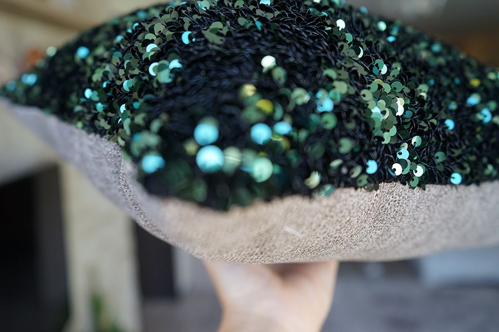 sequins vert sur velours noir et tissu d’ameublement doux gris ou beige sable