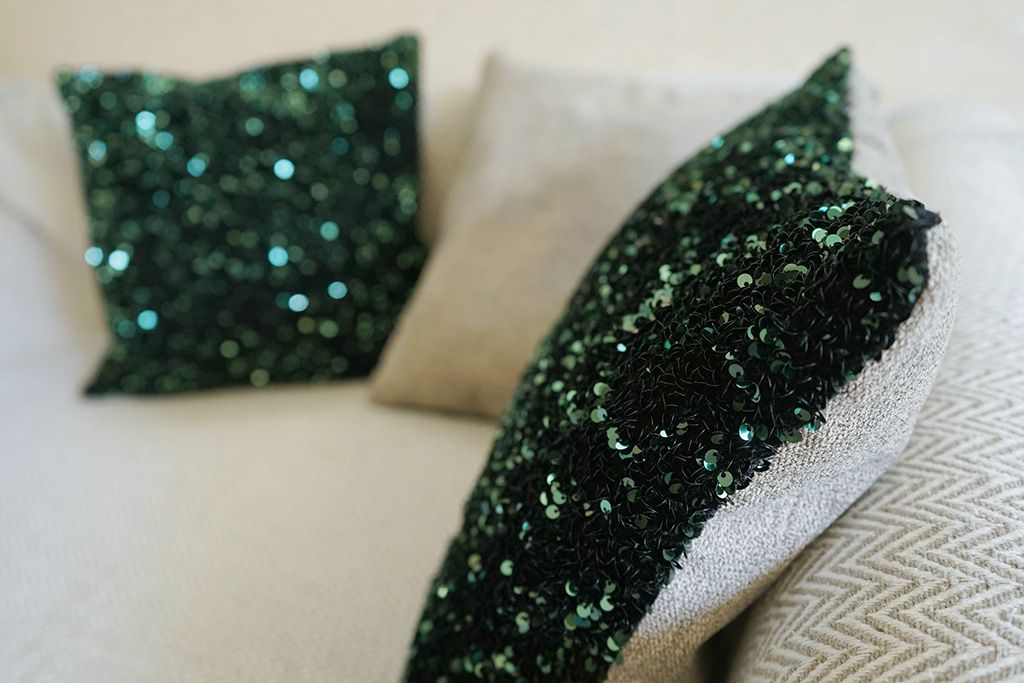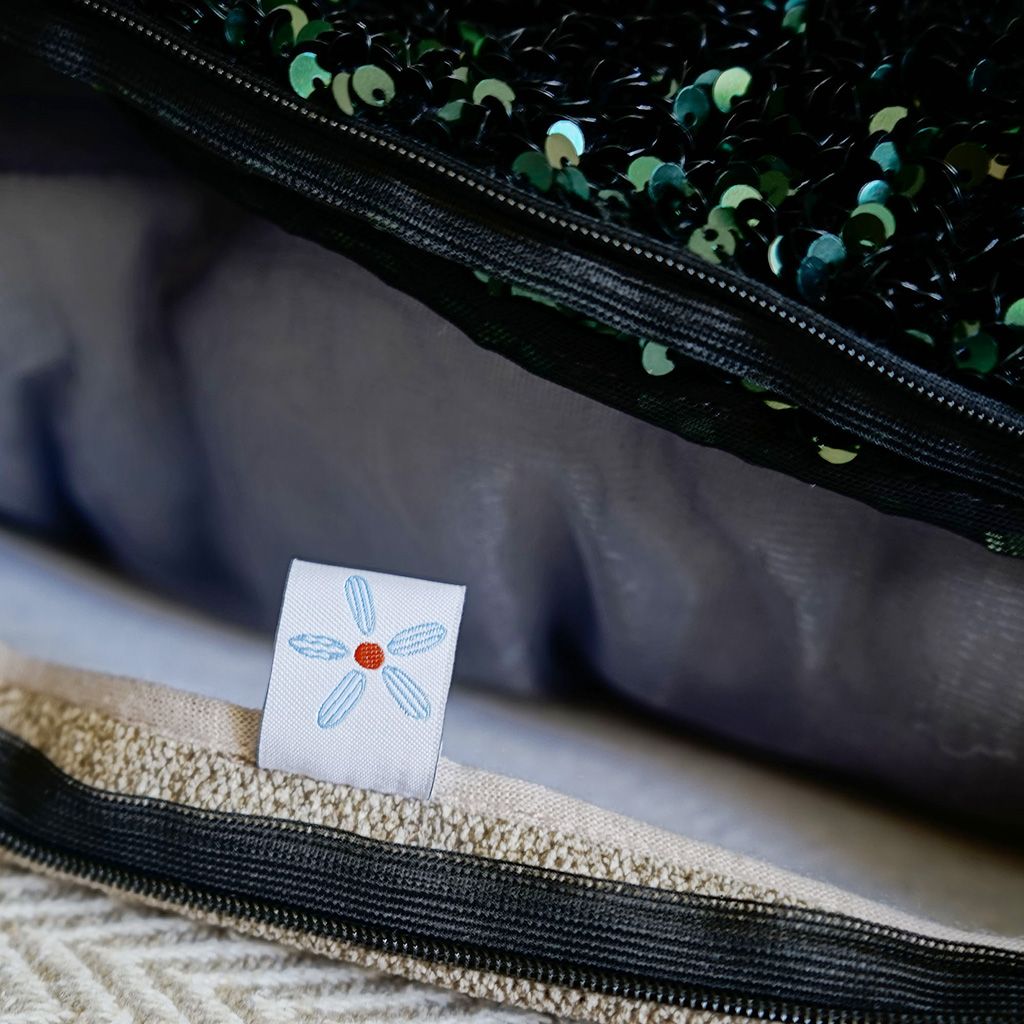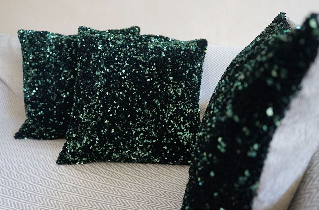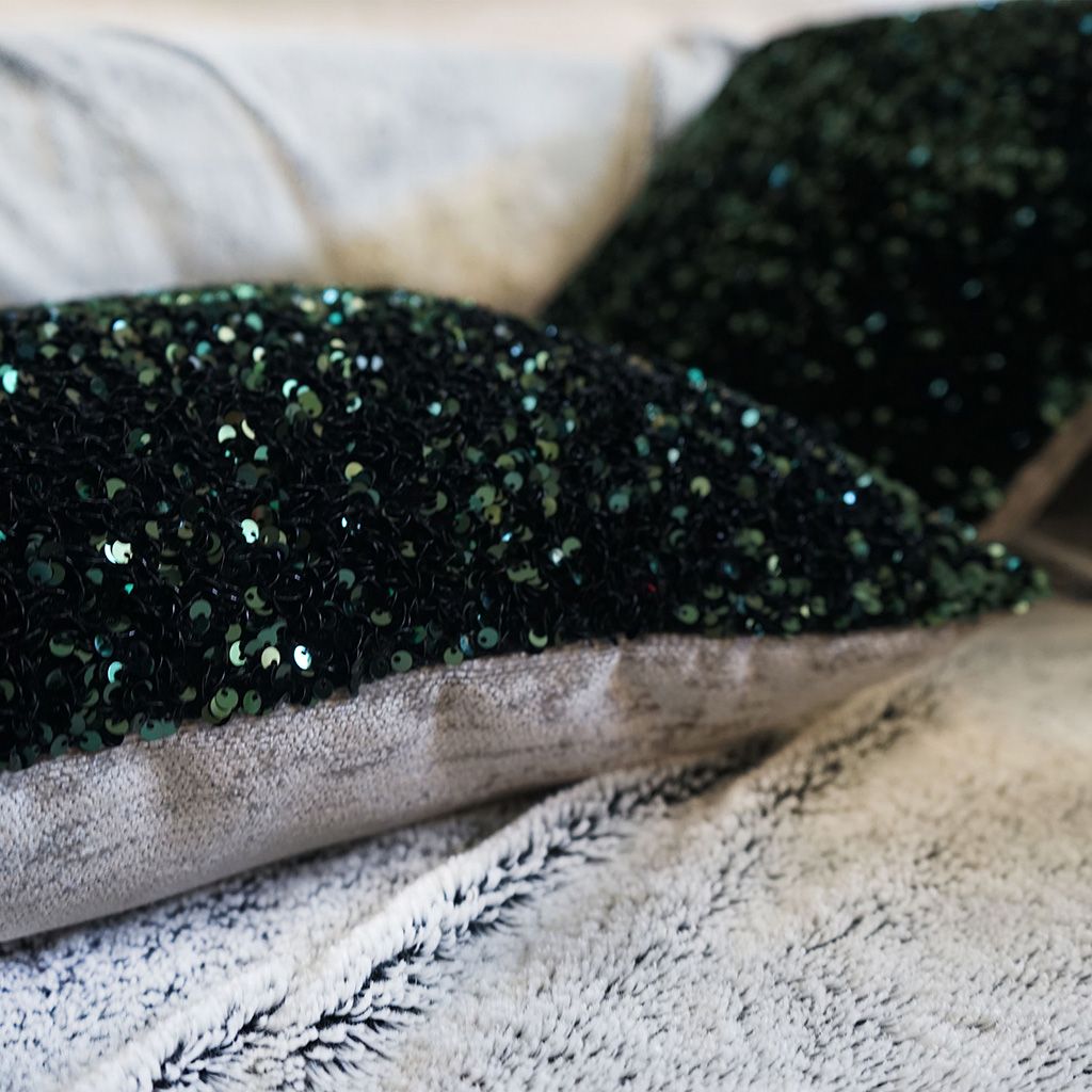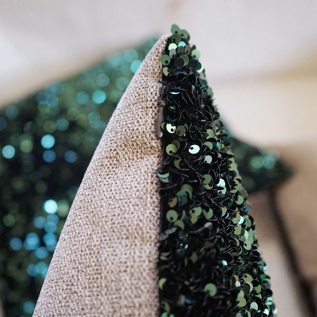 Housse festive pour un coussin: paillettes vertes foncées scintillantes sur le velours noir extensible. Les deux côtés sont doux au toucher, sequins et velours.