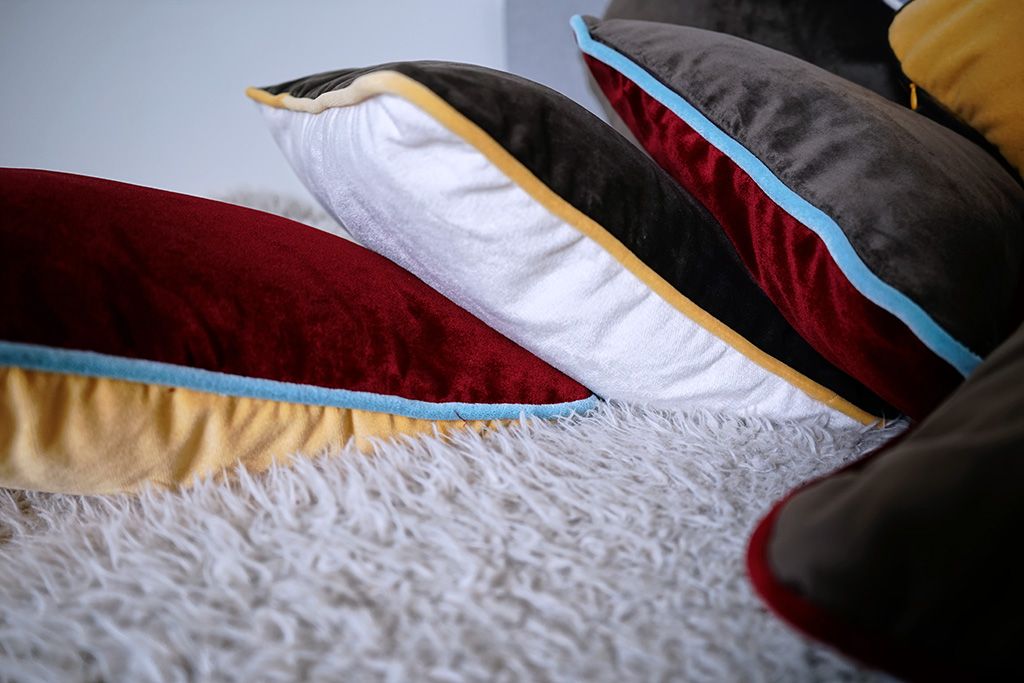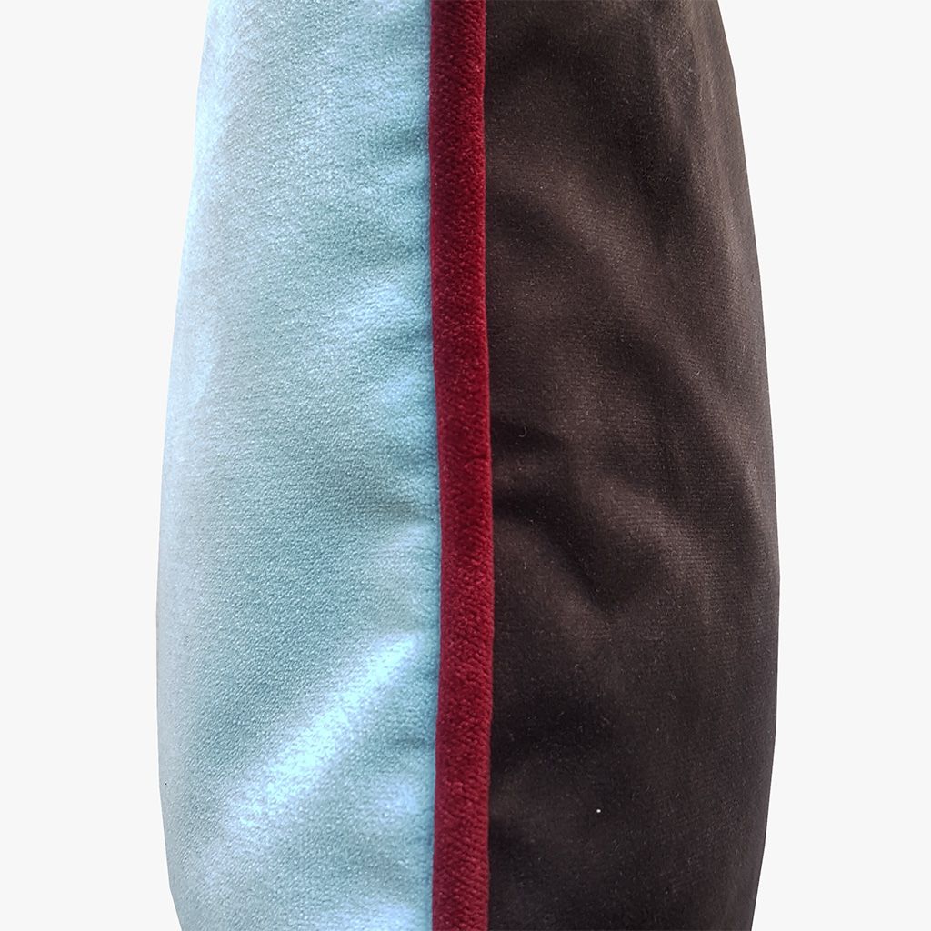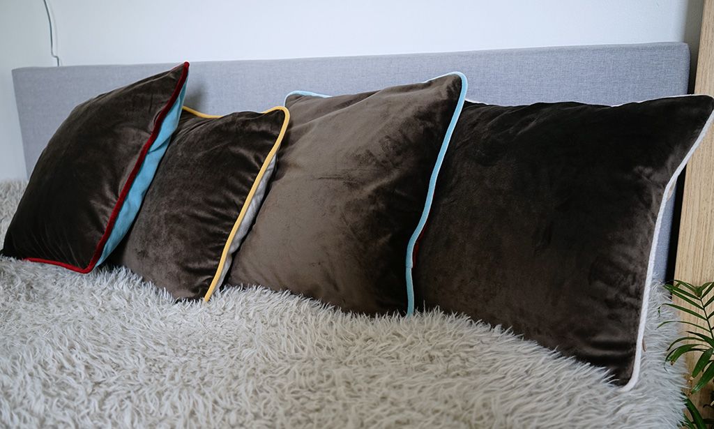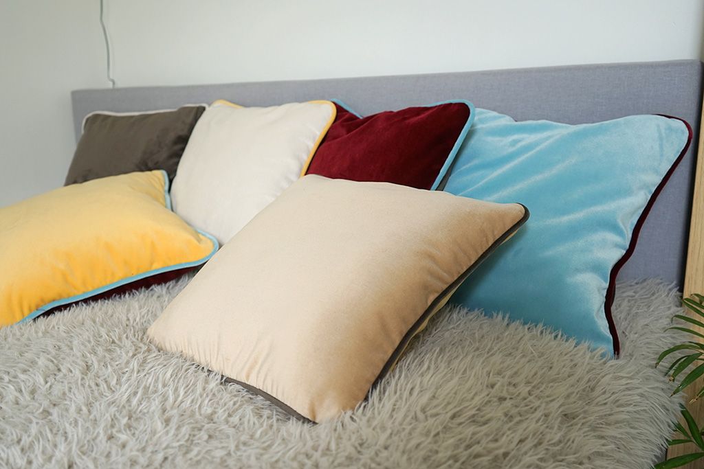 Choix de 12 housses assortis en velours, avec une touche audacieuse de passepoile contrastée: rouge/Bordeau, bleu ciel, jaune, chocolat, blanc cassé, capuccino.