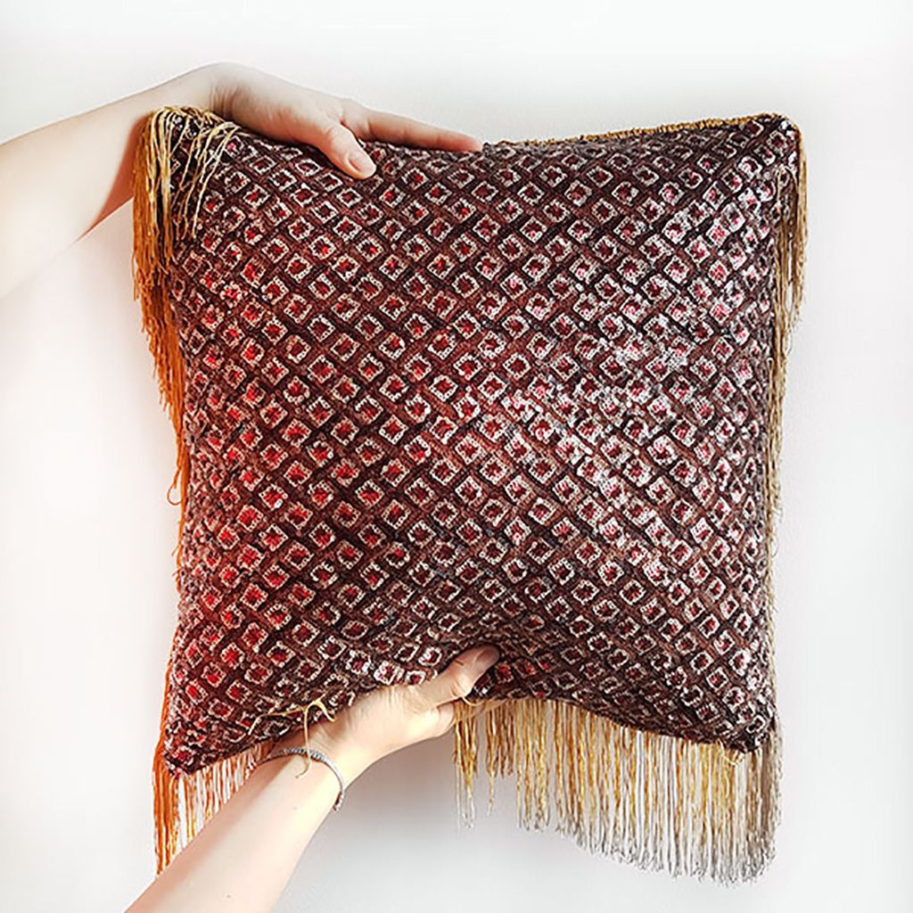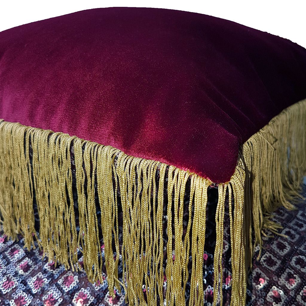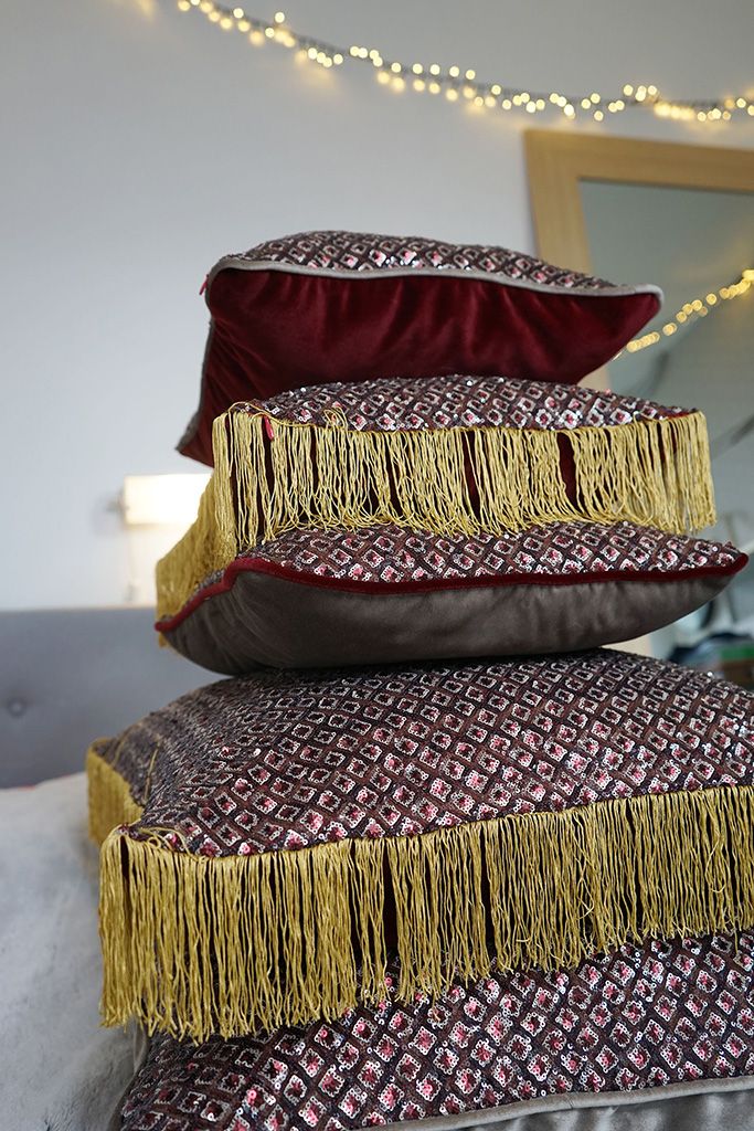 Une housse pour Noël et Réveillon en tissus scintillant au motif géométrique, avec passepoil où frange, style intemporel chic pour les fetes. Petite ou grande, seul ou en bande – l’esprit festif est garantit.