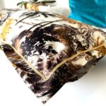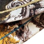 Une petite housse de coussin decoratif en coton imprimé avec motif exotique de feuillage sauvage, pour chambre exotique. Finition avec ruban doré.