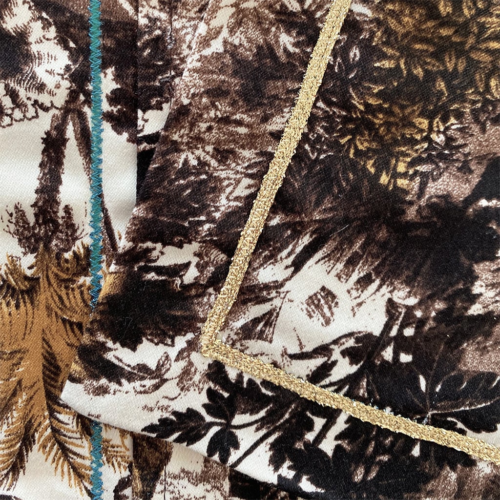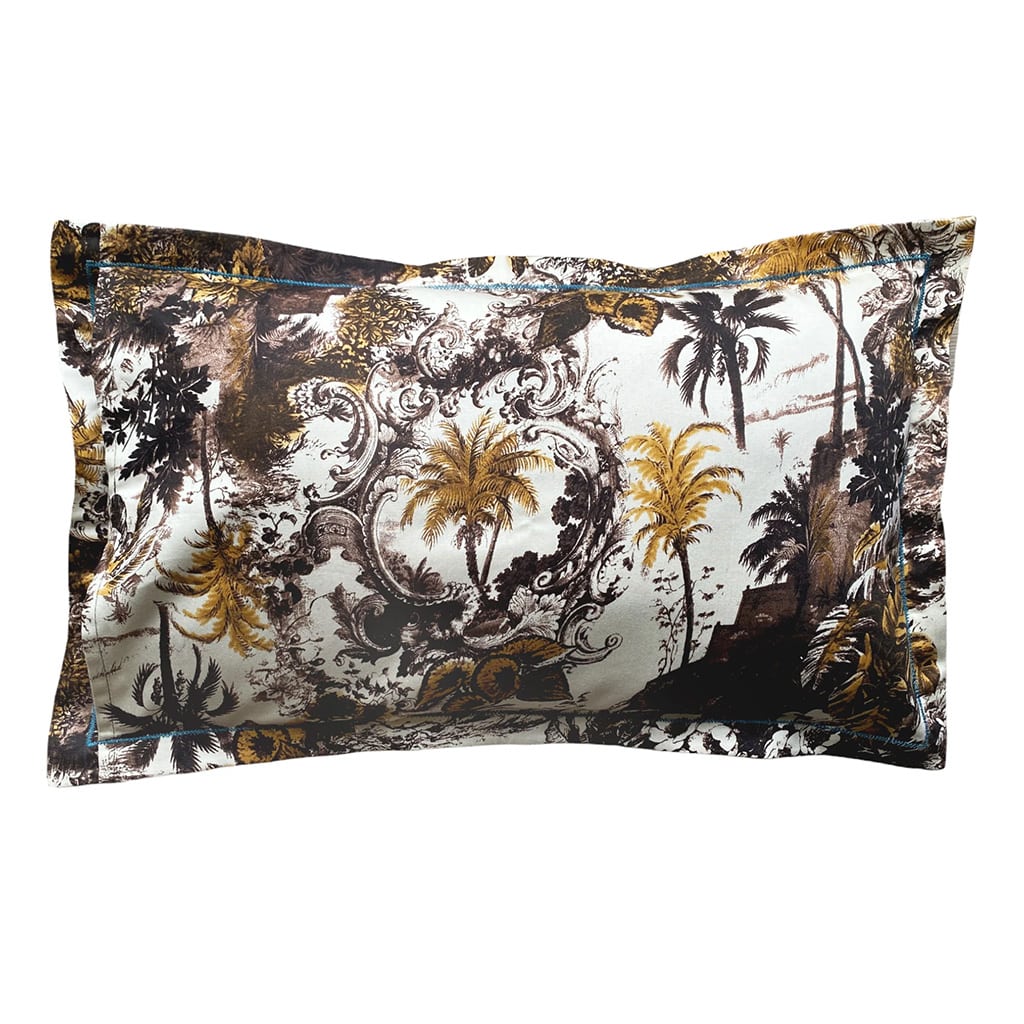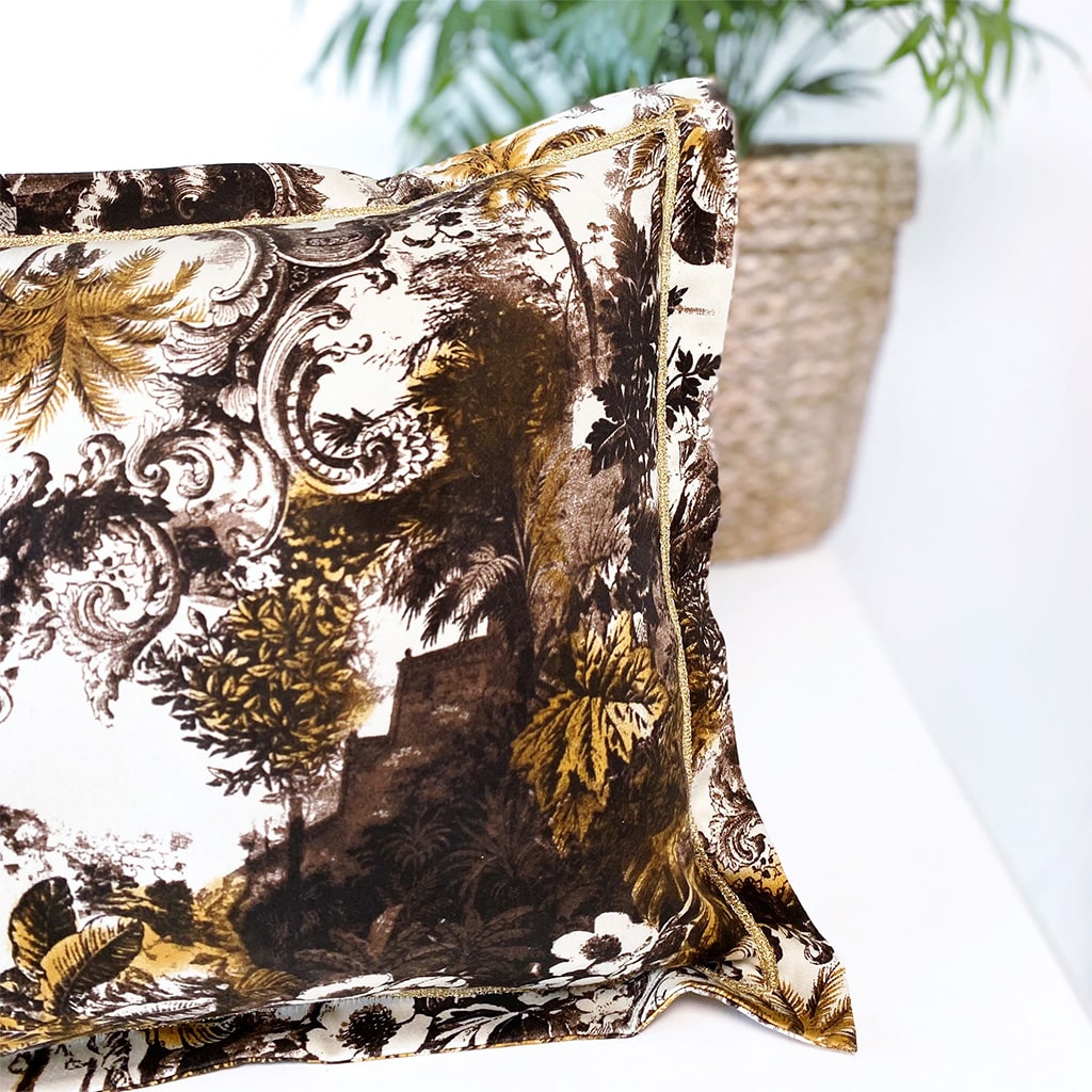 Une petite housse de coussin decoratif en coton imprimé avec motif exotique de feuillage sauvage, pour chambre exotique. Finition avec ruban doré.