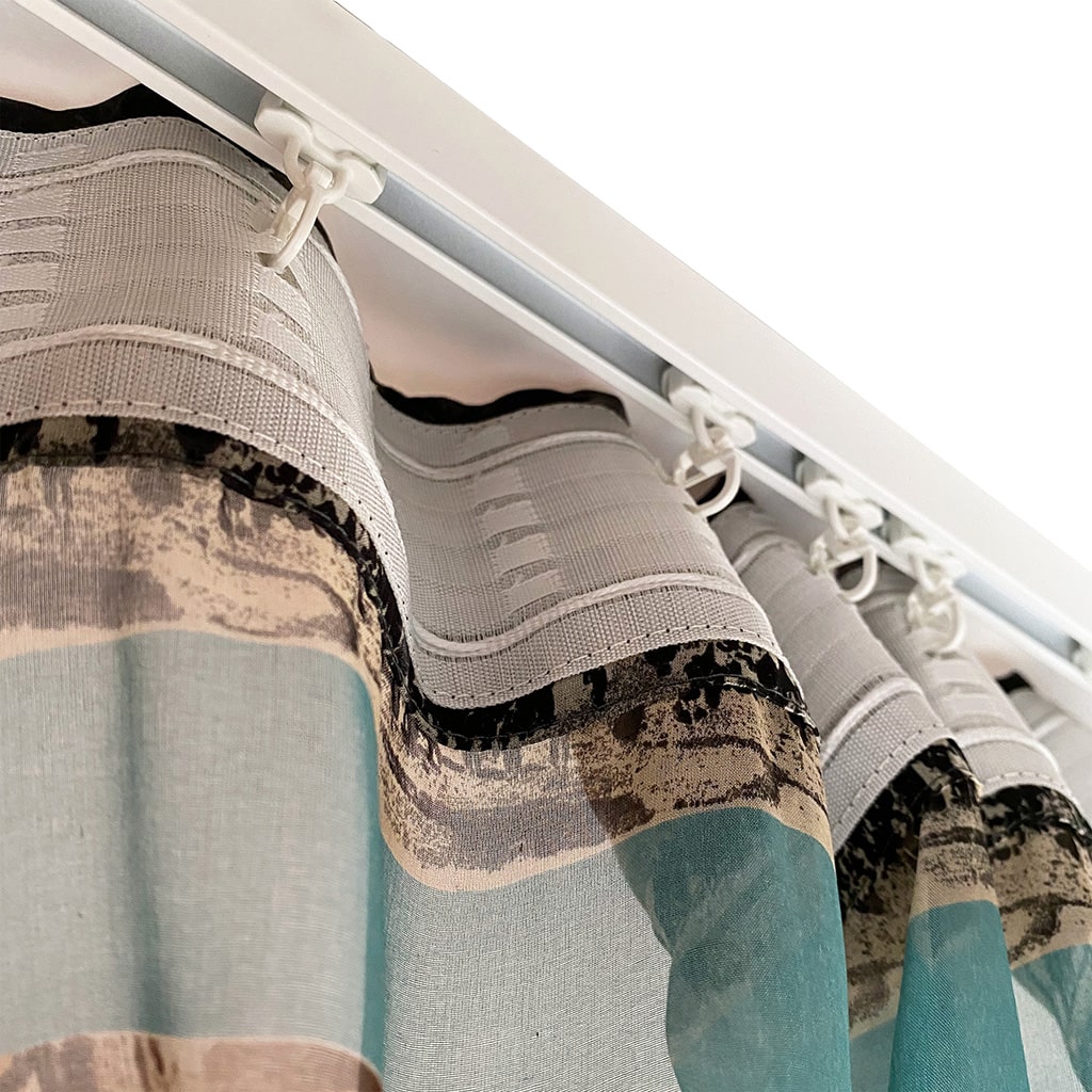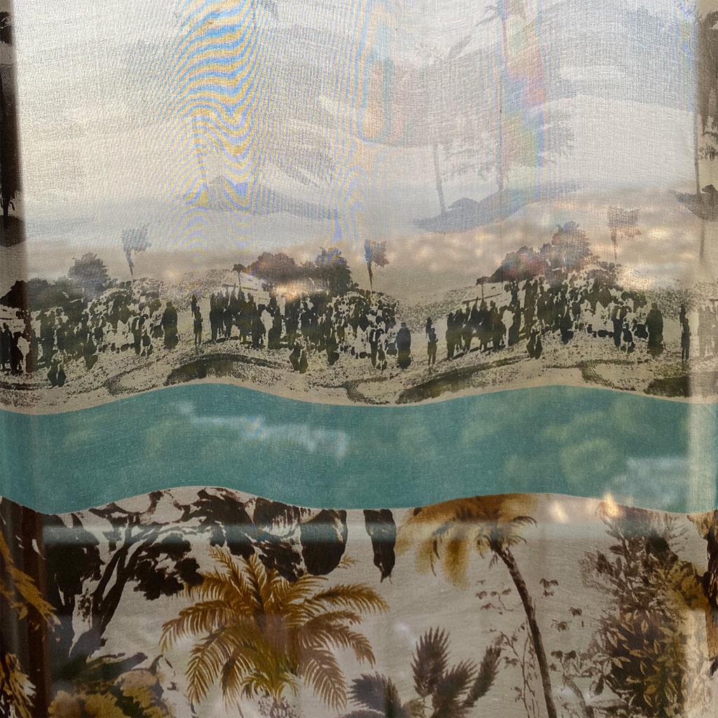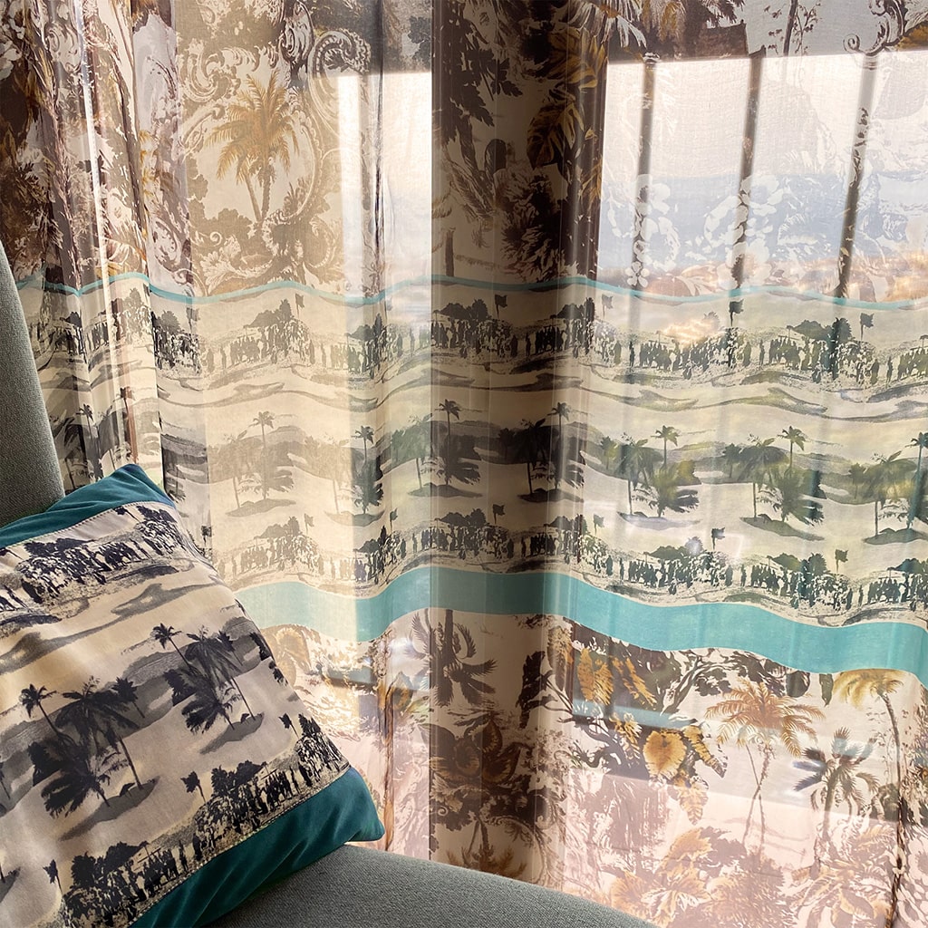 Un voilage transparent léger et aérien pour une fenêtre qui protège des regards extérieurs dans la journée et laisse passer la lumière Rideau/ voile unique imprimé motif jungle, sauvage, colonial, pour la chambre moderne 135x250cm / 53×98 pouces. Longueur personnalisable. Les trois motifs imprimés se répètent sur un panneau: palmiers en marron-beige, plage avec palmiers en gris clair, ligne en bleu jade.